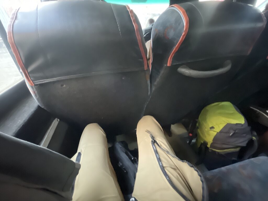いざ乗車。シートピッチは割と広く、椅子自体も柔らかかったのでちょっと一安心。充電できるようなものはありません。大きい荷物はルーフトップに乗せられるので、必要なものは手荷物用のバックに入れておくことが必要です。