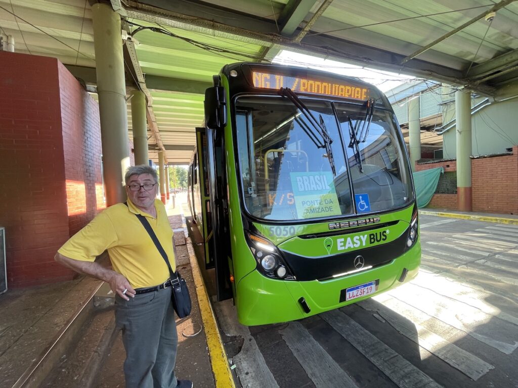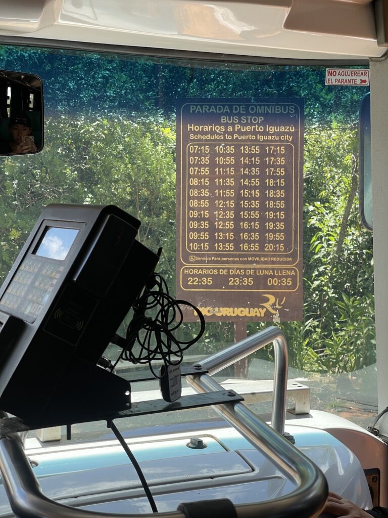 バス停は同じですが、乗るバスは違います。アルゼンチン行きのインターナショナルバスが止まりますのでそれに乗ります。目印はアルゼンチンの国旗です。料金はローカルバスよりも高くて30brl(≒825円/1レアル≒28円@12/’25)です。