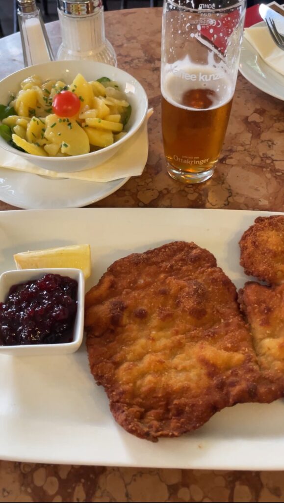 こちらがオーストリアの伝統料理ウィーナーシュニツェルです。せっかくなので食べてみることに。薄い豚肉にパン粉をつけて揚げた料理です。驚いたのは甘いジャムで食べること。これは日本にはない組み合わせです。