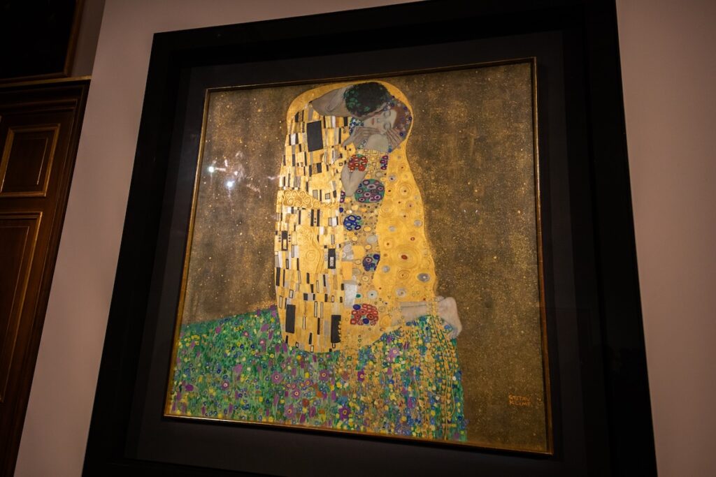 接吻はクリムトの最盛期にして最高傑作と言われているようです。クリムトは女性を中心に人間の官能や愛、生の循環といったテーマで描くことが多かったようです。画材には金や銀がふんだんに使われているそうです。女性の頬に口付けをしているところなのか、それともこれから口付けをするところなのか、見る側に委ねられているんだとか。華やかで、男女の愛の絶頂を表現しているのかもしれません。