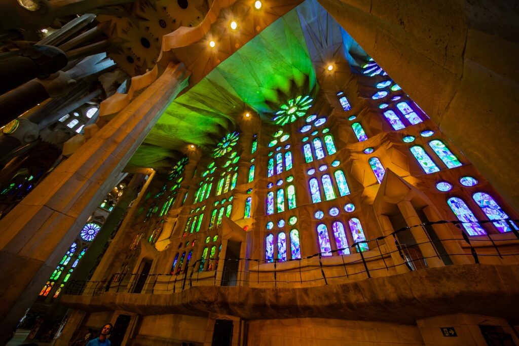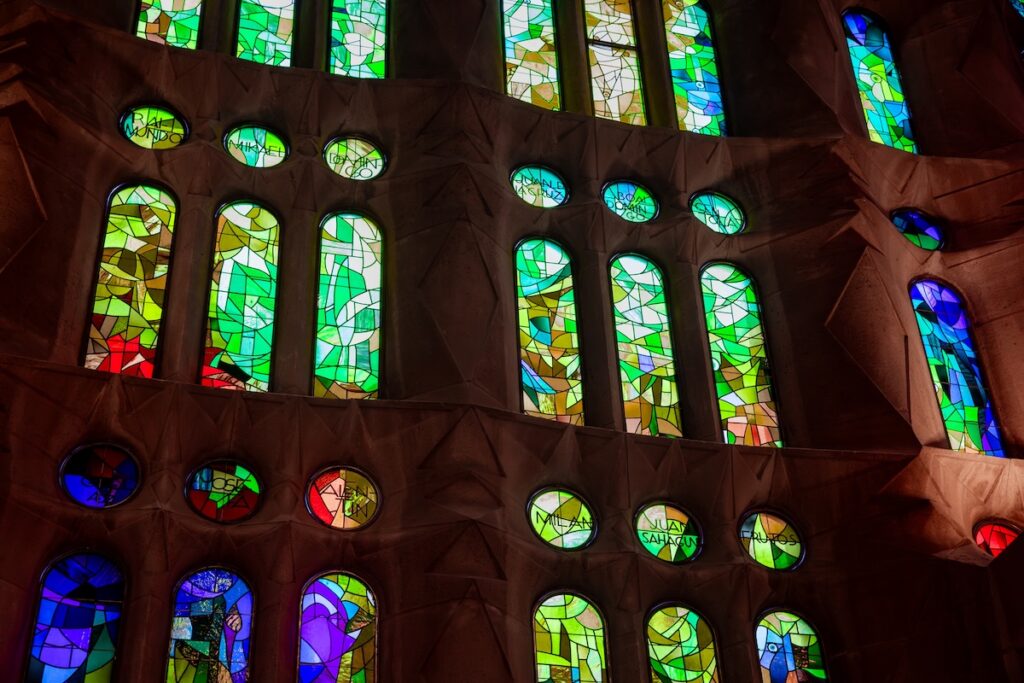 で、感動ポイントとしては内部です。といっても、大聖堂とか散々見てきてしまったので感動の度合いは多分初めて見る人よりもだいぶ薄いと思います。それでも、綺麗だと思ったはステンドグラスの色合い。これは美しかった。アントニ・ガウディは自然を愛していたということですが、色合いはまさに自然の色(私見です)なんじゃないかと思いました。オレンジや黄色は太陽。緑は樹々、青は海。これらが太陽の光に照らされてキラッキラ光っていました。ステンドグラスにはフレスコ画が描かれていなかったので、それも個人的には好きだったかもしれません。ケルン大聖堂のステンドグラスも美しかったのは間違い無いですが、こちらはフレスコ画が描かれていました。これは好みだと思いますが、皆さんはどちらがお好きでしょうか?