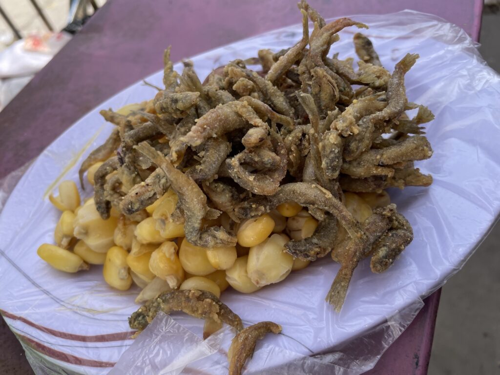 道の屋台を発見。おばあちゃんがやっているお店で、他に食べるものもないのでお昼がわりに注文。たいして期待していない時に来るこれ! 一口食べて、うーーーーん!!うまい✨ これは美味かった。小魚は小さい割にしっかりと身がついて中はとても柔らかいけど、外はカリッと上がっていて香ばしい香りが口いっぱいに広がる! 美味!そして、ビールが欲しいやつでした(笑 下にあるとうもろこしみたいなのはあまり美味しくなかったけど、魚が美味しすぎて先に食べてしまい最後ちょっと辛くなったやつです(笑