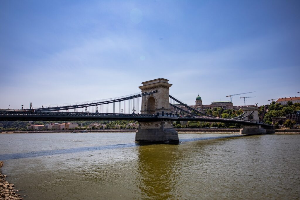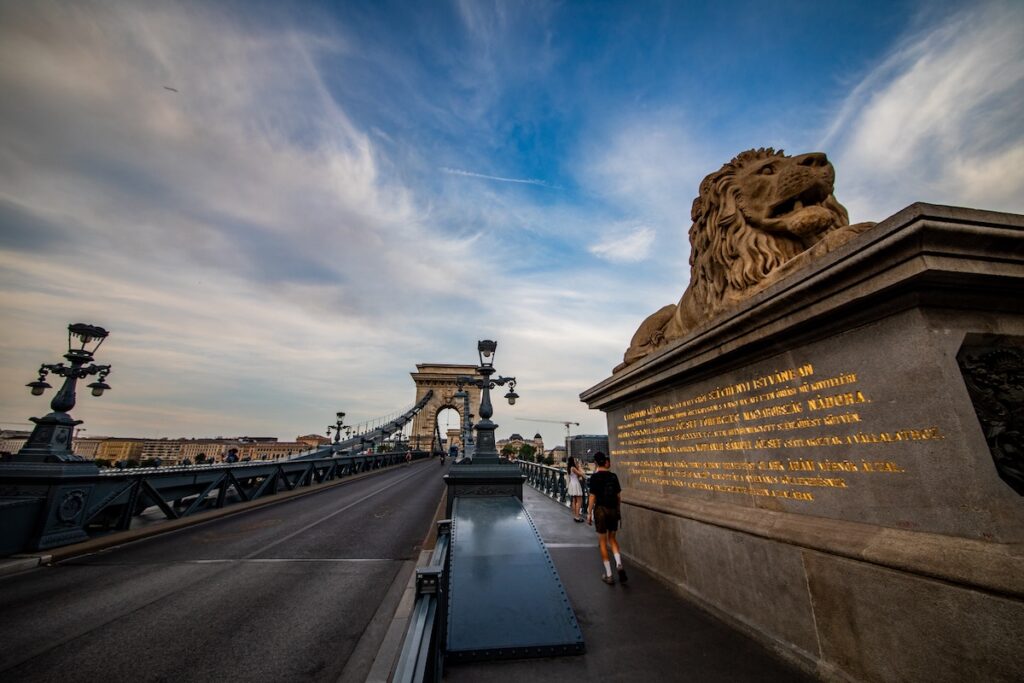 靴のモニュメントからすぐ横にある大きな吊り橋がセーチェーニ鎖橋です。国会議事堂のライトアップとともにブダペストの美しい景観を作っている橋です。橋の入り口にはライオンの像が置かれており、フォトスポットになっているようです。