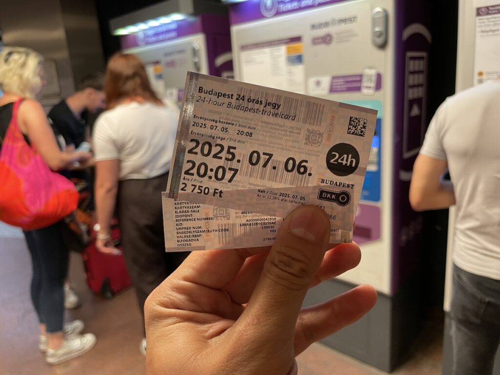 紙チケットの購入も簡単でした。gogole mapを頼りにバス停から地下鉄まで移動です。乗り場の手前に紫のチケット販売機があるので、それで購入すればOK。30分券が600フォリント(260円)、 24時間券が2,750フォリント(1,160円)なので、5回以上乗るようであれば24時間券がお得です。まぁ、観光もすると思うので24時間券購入で良いかと思います。