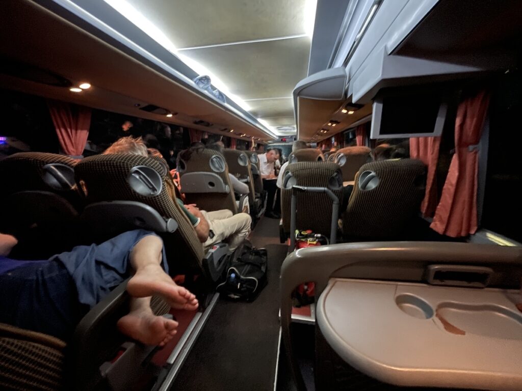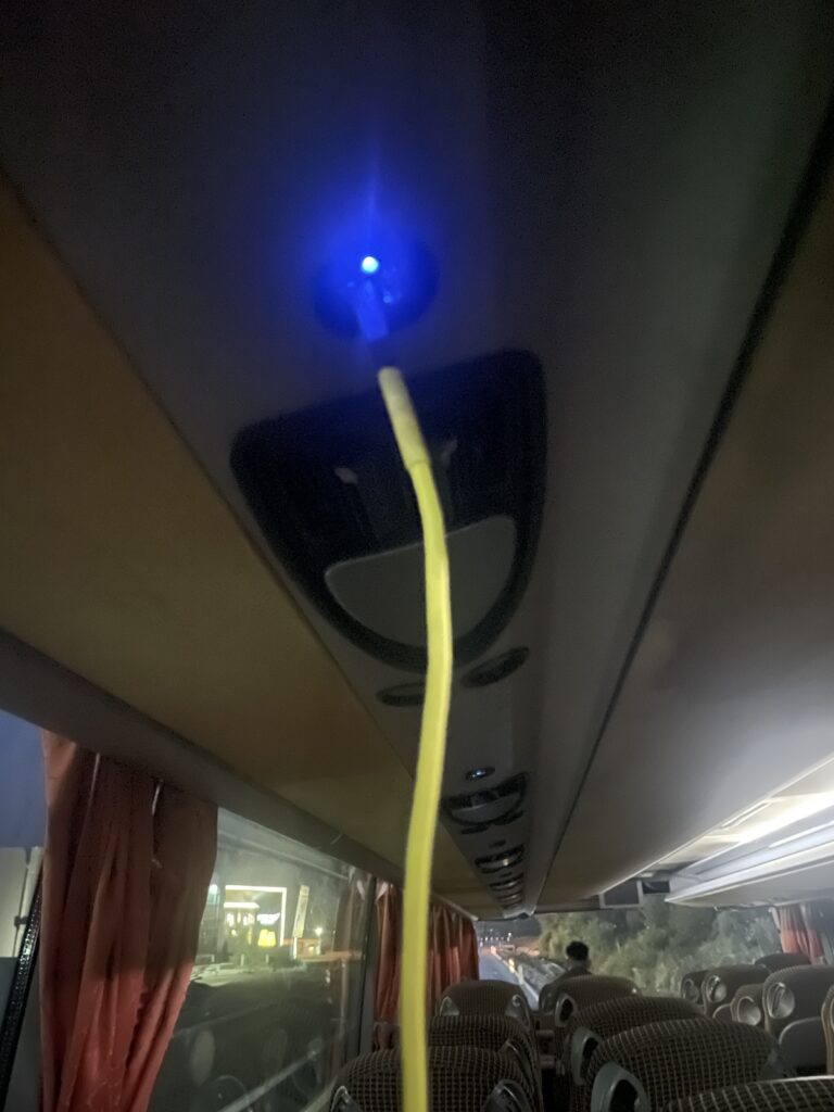 そんなこんなで出発したバス。普通の椅子です。そして、思った以上にしょっちゅう止まって電気もつくので落ち着かないし、休憩多くない?っていう感じでした。