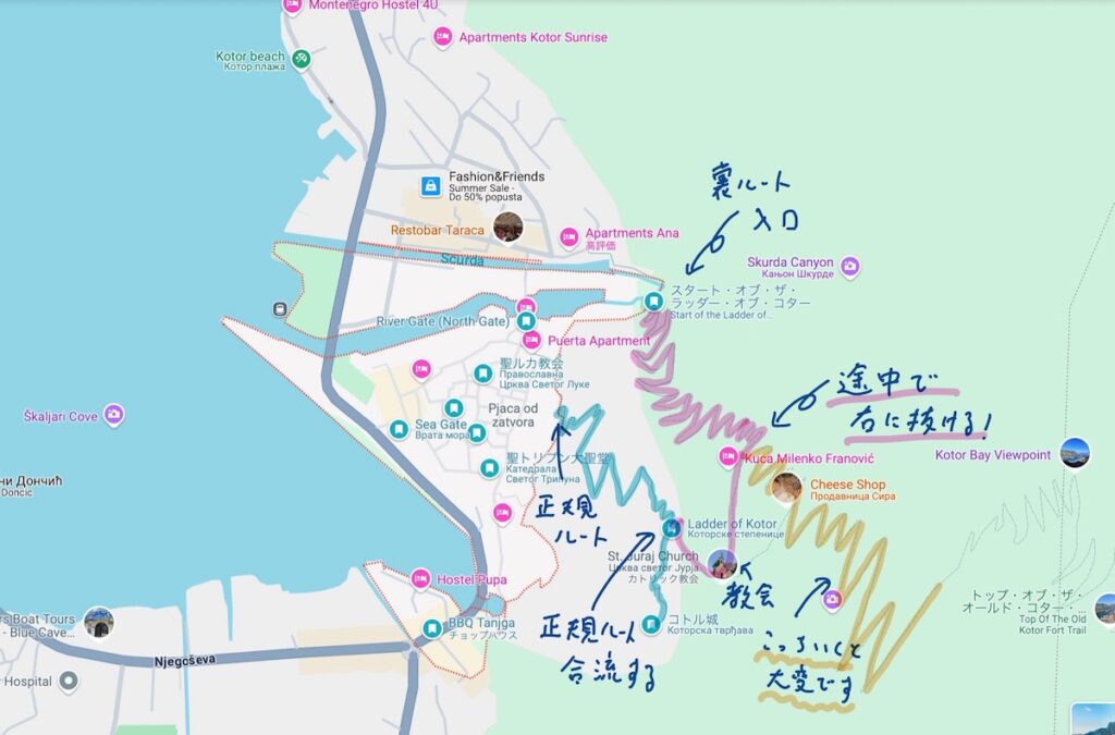 他のブログでも紹介されていますが、初見の人もいると思いますのでここでも紹介します。実はコトル城までは2つのルートがあります。一つは15ユーロの正規ルート(階段)、もう一つは無料の裏ルート。裏ルートなどというと違法?みたいな感じになりますが、調べたところによると黙認?のような感じになっているようです。まぁ、そこまで厳しく取り締まるという感じではないっていうことですかね。お国柄かな?