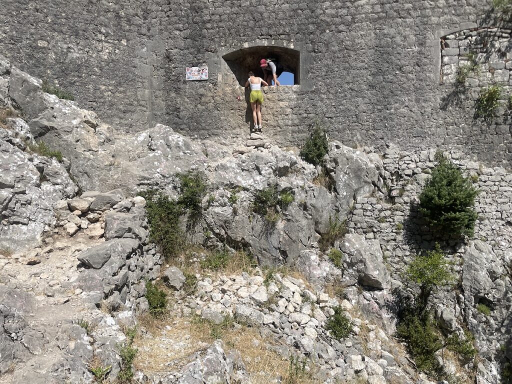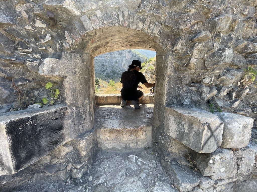 入り口のところからジグザクの道を歩いて登っていきます。もともとはハイキングコースのようで、途中でコースを外れてコトル城の方に向かっていきます。間違ってハイキングコースをそのまま進むと全く違うところに行ってしまいますのでお気をつけください。ルートを外れるのは下の写真のところ。石垣のツルツルした岩が目印です。運が良ければ降りてくる人が見えたりします。