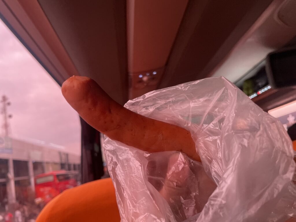 持っていたおやつで空腹はしのごうかな?と思っていたのですが、なんか美味しそーなソーセージの販売が。聞いてみたら30zk(≒207円/1クワチャ≒6.9円@11/’25)と言うことだったので一本購入。