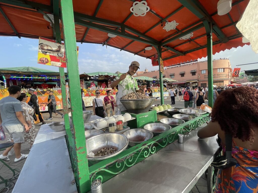 屋台はBBQ屋さんが多いですが、値段を確認したところ完全なる観光地価格で高い! なので、BBQは回避して、なんか美味しそうだったラム肉の煮込み料理を注文。こちらは40mad(≒640円/1ディルハム≒16円@’25/8)でした。写真忘れてしまいました。