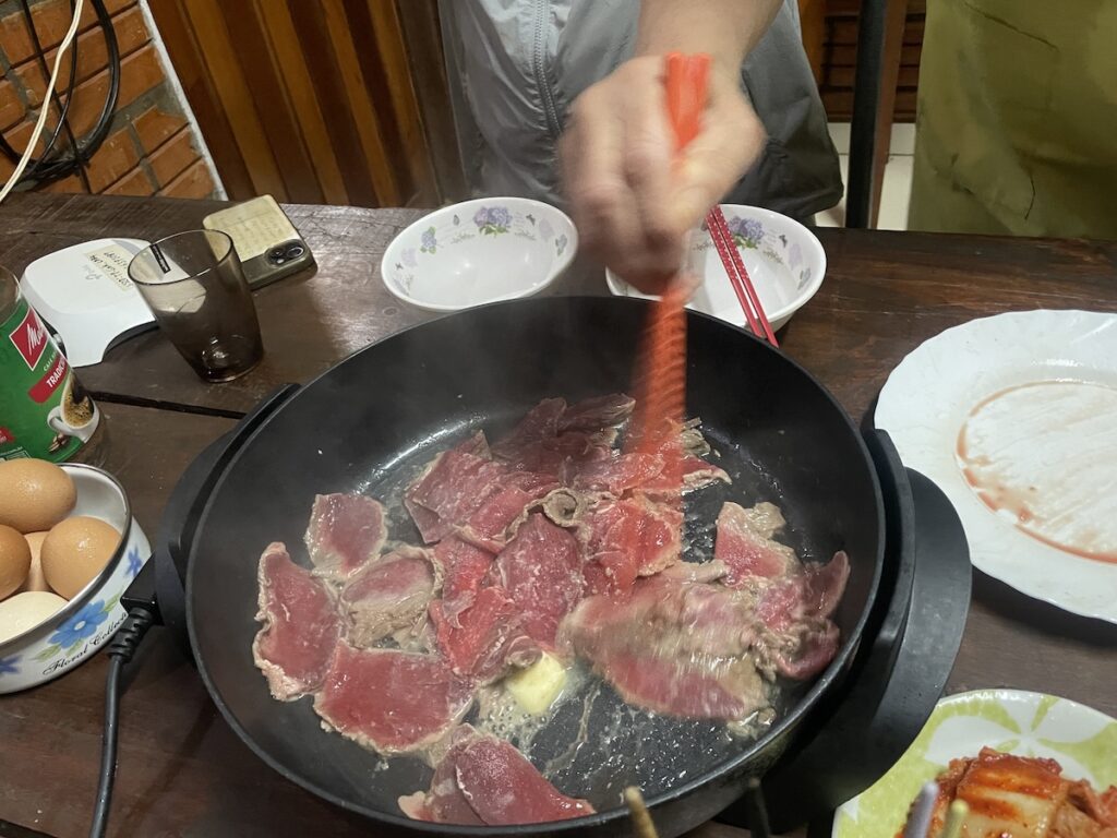 民宿小林の名物はこちらのすき焼き! 到着すると出発するまでに必ず一食出してくれます。昆布と椎茸の出汁で作った割汁がマジで美味! そして、パラグアイでは牛脂が手に入らないらしくバターで作っていてそれがまたいい香りなのです。これは鉄板の代表料理!!