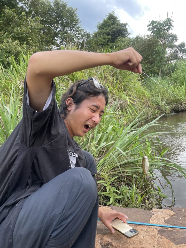 近くの小川で魚釣り