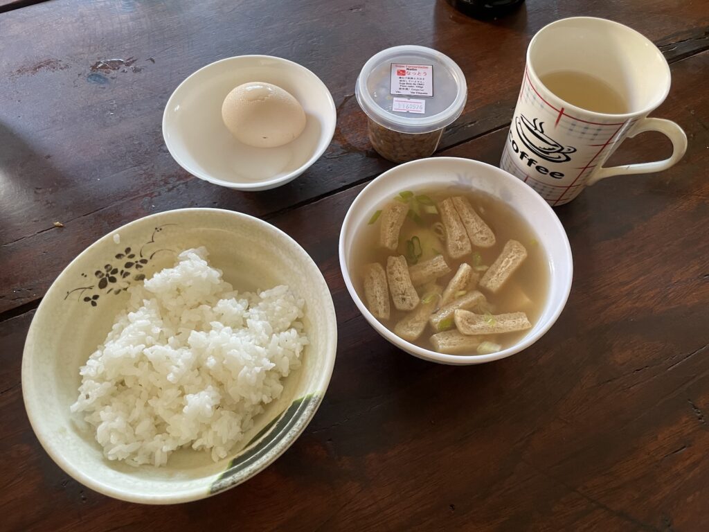 夕食を食べたら朝食ですよね! この朝食がまた故郷を思い出させてくれる、昔ながらのThe 日本食。逆にいうと、日本でもこんな日本食は今や珍しいかもしれません。田舎のおばあちゃんちに来たかのようなご飯。リアルぼくのなつやすみはこういうのです(笑