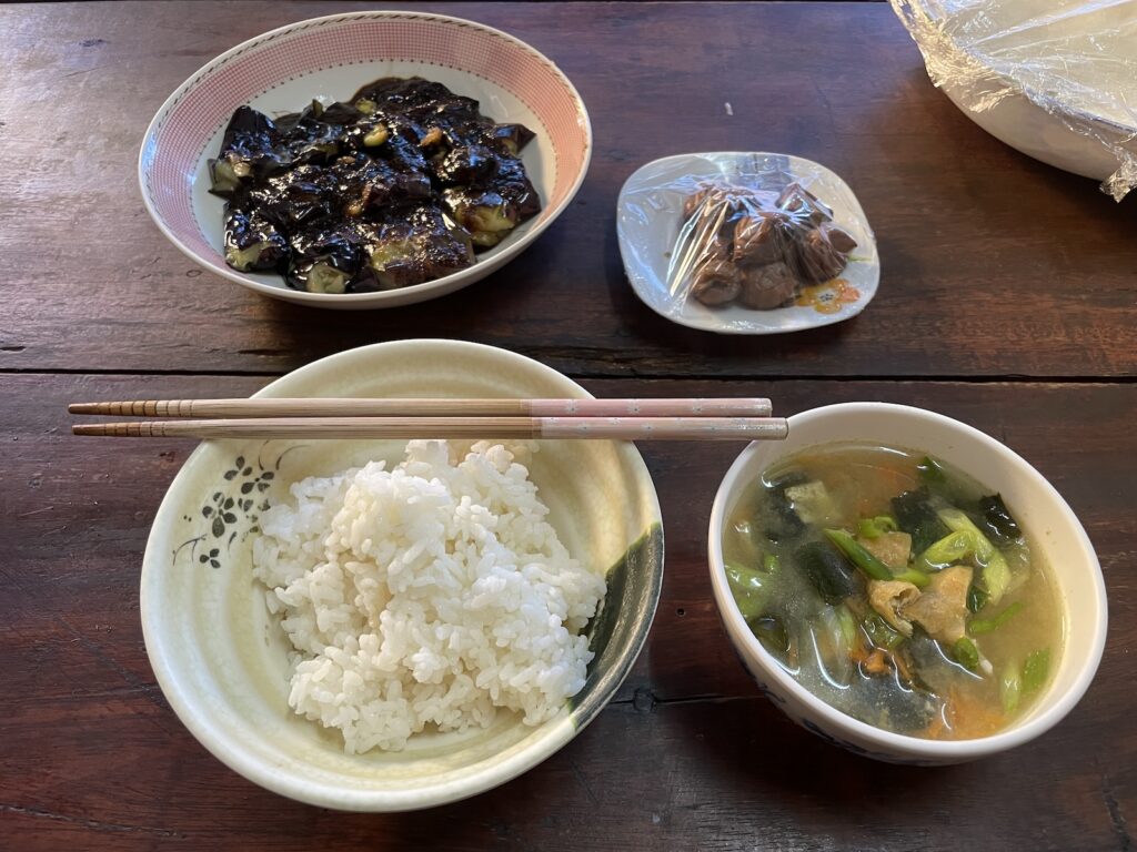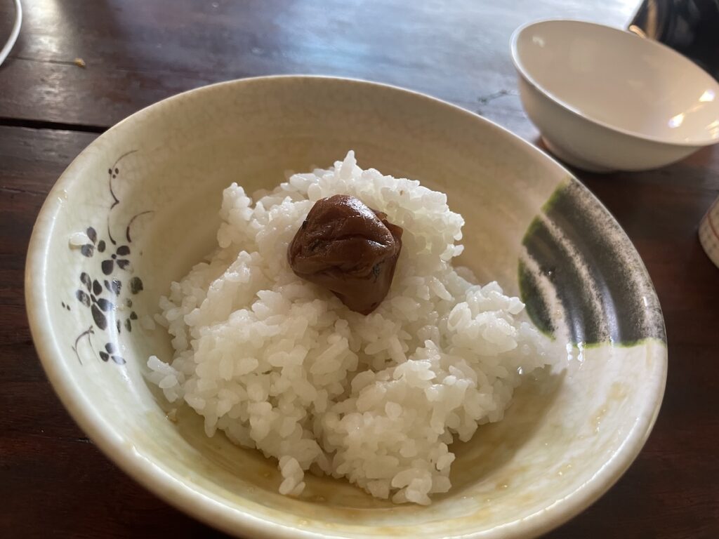 梅干しもあります。それがまたサイコーです。揚げなすの炒め物も白米キラー!! ニンニクの香りが食欲をそそりまくります! ナスがあったらぜひ作ってもらってください。おいしすぎます。