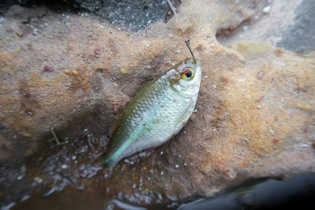 釣れるのはこんな小魚。なんていう魚かはちょっと分かりませんが、タナゴのようにも見えます。針が大きいので釣るのはなかなか難しいのです。