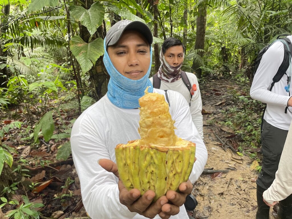 こちらはカカオの仲間らしい。食べられるよということで、一口いただくことに。味わいはジャックフルーツとかドリアンとかそっち系統の味わい。甘さは控えめでマンゴーのような酸味があるフルーツです。割と美味しい。そして