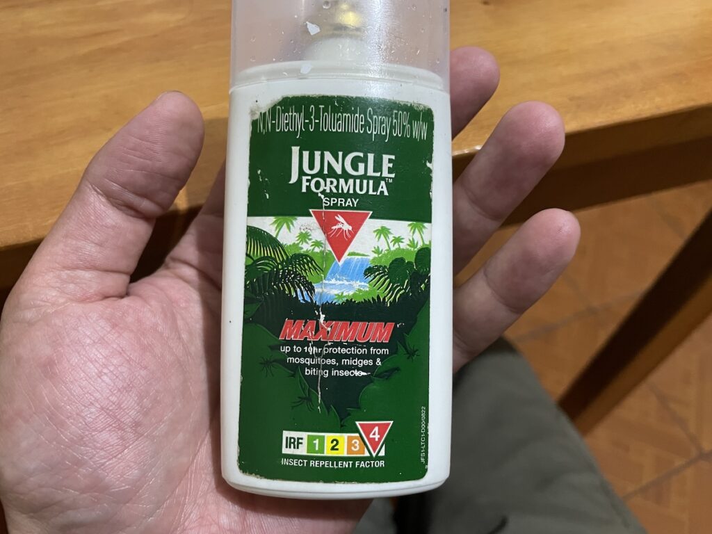 これはマジで重要!! 一番強力な虫除けスプレーが必要です。日本だとそこまで強力なものは必要ないので、日本で買って行くよりも現地で買うのがおすすめです。値段は張っても買う価値あり。