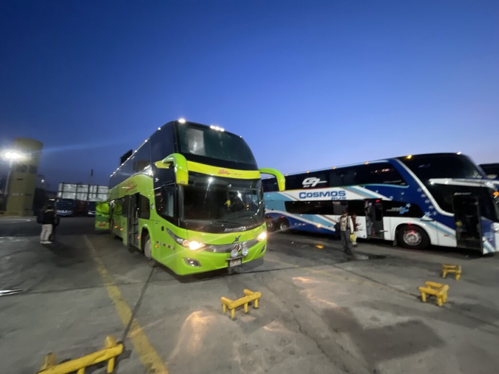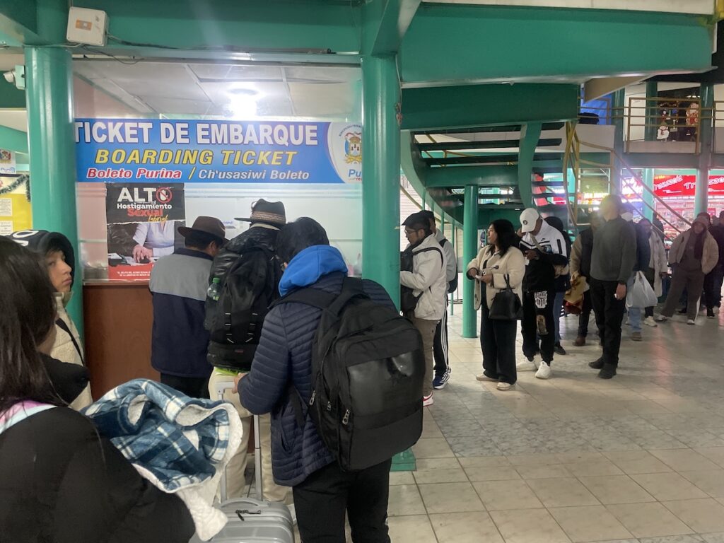 チケットは持ってますが、一度窓口へ。ペルーはターミナル使用量の支払いが求められるので、受付のスタッフさんの指示に従ってターミナル使用料をお支払いです。1.5pen(≒70円/1ソル≒47円@1/’26)です。地味に並ぶので気持ち早めが良いかもしれません。