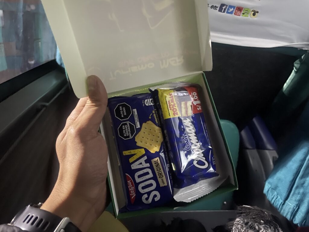 バスはこちら。南米のバスは本当に快適。そして、今回は長時間ということもあり、軽食?もついていました。