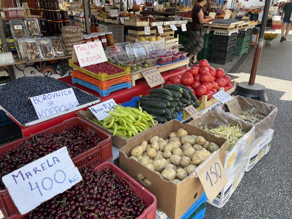 家電や衣類などの日用品から、野菜、果物、お肉などいろいろなものが売っています。そして、セルビアは食材の種類が豊富で新鮮!! ベリー系もブルーベリーからクランベリー、ラズベリーなどたくさんある。少し滞在するようだったら、ここで食材調達して自炊もしてみたかったですね。今回は短い滞在なので、見るだけでした。