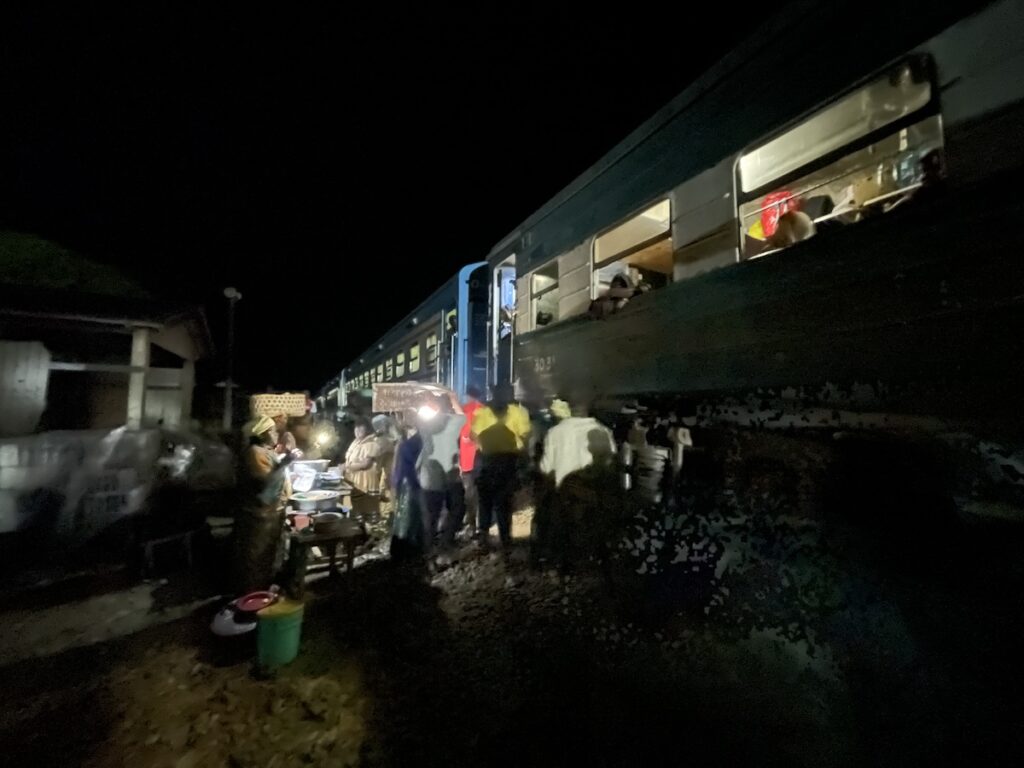 時折長時間の停車を挟みます。サードクラスの皆さんは途中の駅でご飯を買ったりして食べるみたいで、そういった休憩時間もあり。レストランのご飯食べてしまいましたが、場合によっては駅で売っているものを買ってみても楽しいかもと思いました。