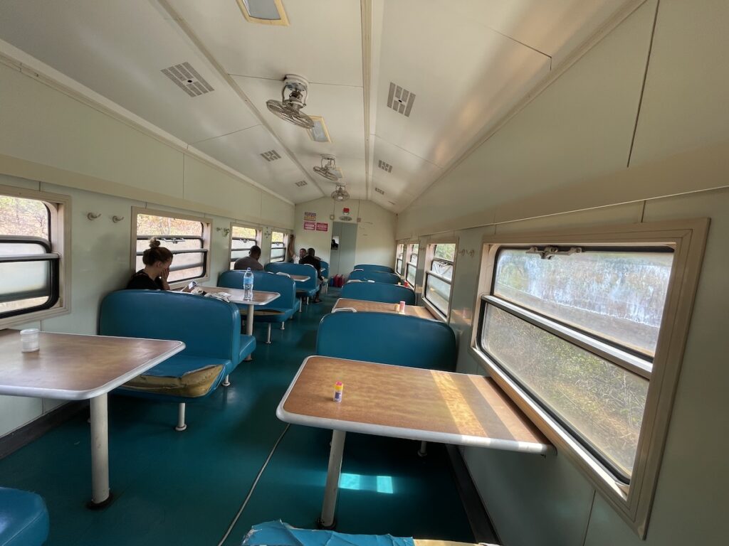 食堂車両はこんな感じ、割といつでも空いていて座れないということはありませんでした。多分だけど、ファーストクラスとセカンドクラスの乗客しかここは使えないのかもしれません。ご飯を食べていない時も利用できて、窓から景色を眺めることが可能です。