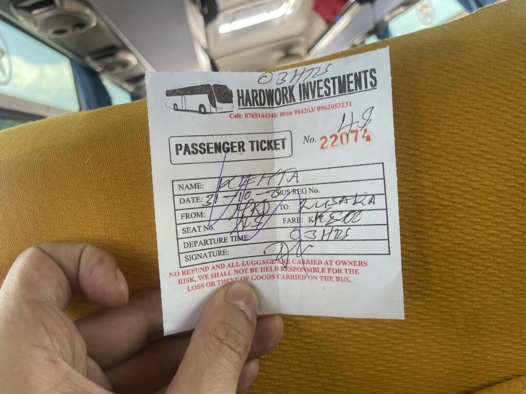 チケットは写真のチケットと昭和の切符みたいな厚紙の小さいチケットの2種類があるようです。使い分けについてはよくわかりません。自分はファーストクラスで38,300tzs(≒2,298円/1シリング≒0.06円@’25/10)でした。