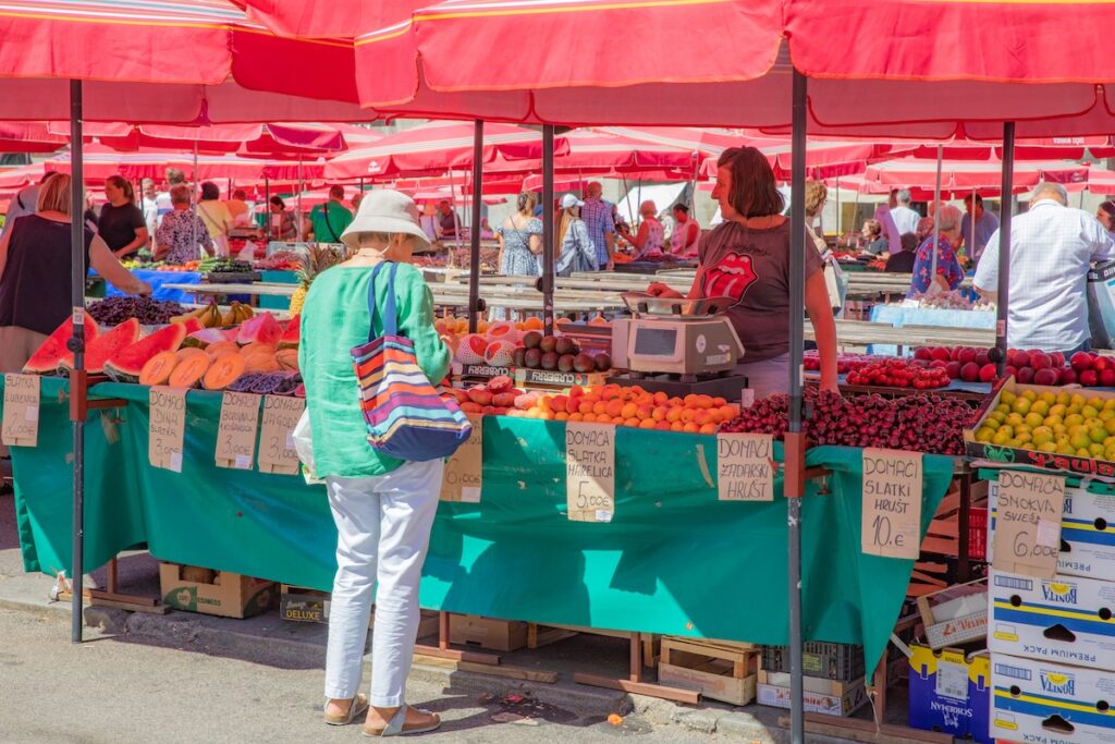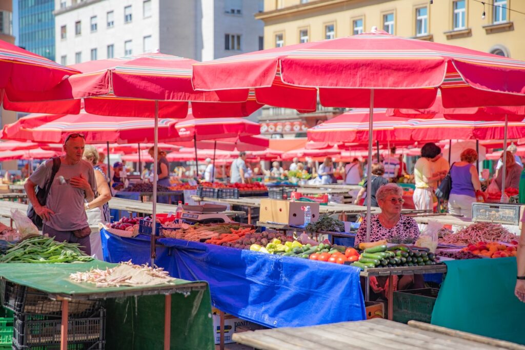 イェラチッチ広場から階段を上がるとすぐにドラツ広場があります。ここはザグレブ市民の台所らしく、たくさんの食材が並び活気あふれる場所です。赤い傘がバー!っと広がっており「おー市場!」となります。