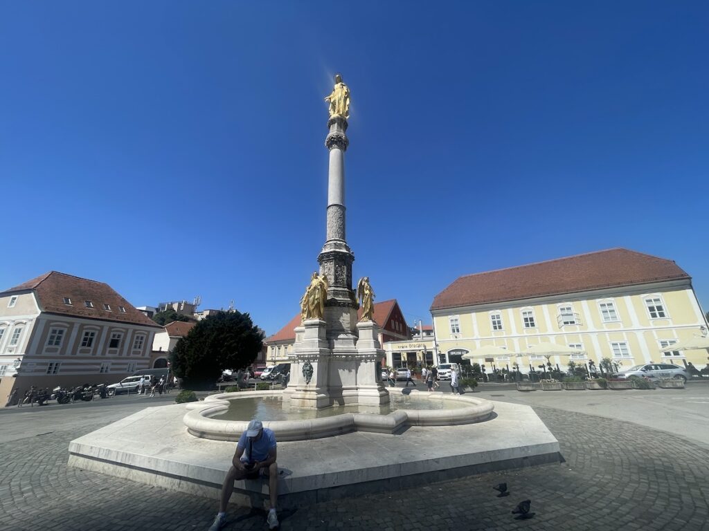 像の下で大道芸人がおりましたが、準備し終わって10分ほどで撤退していました(笑 今は7月、それもヨーロッパで異常な熱波が発生中。大道芸をするには暑すぎたようです。